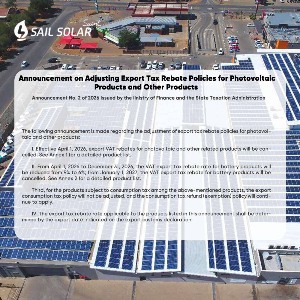 Am 8. Januar 2026 gab das chinesische Finanzministerium offiziell die Abschaffung der Mehrwertsteuererstattung für Solarmodulexporte bekannt und senkte gleichzeitig den Erstattungssatz für Lithiumbatterien. Ausländische Käufer sollten sich diese Gelegenheit nicht entgehen lassen!
