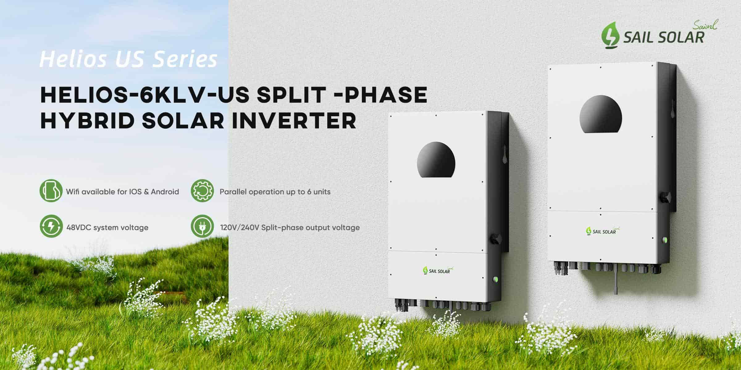 Der Helios-6KLV-US 120V/240V Hybrid-Solarwechselrichter mit zwei Phasen ist wasser- und staubdicht (Schutzart IP65) und unterstützt verschiedene Ein-/Ausgangsoptionen. Bis zu sechs Geräte können parallel angeschlossen werden, was ihn zu einer skalierbaren und vielseitigen Lösung für Privathaushalte macht.