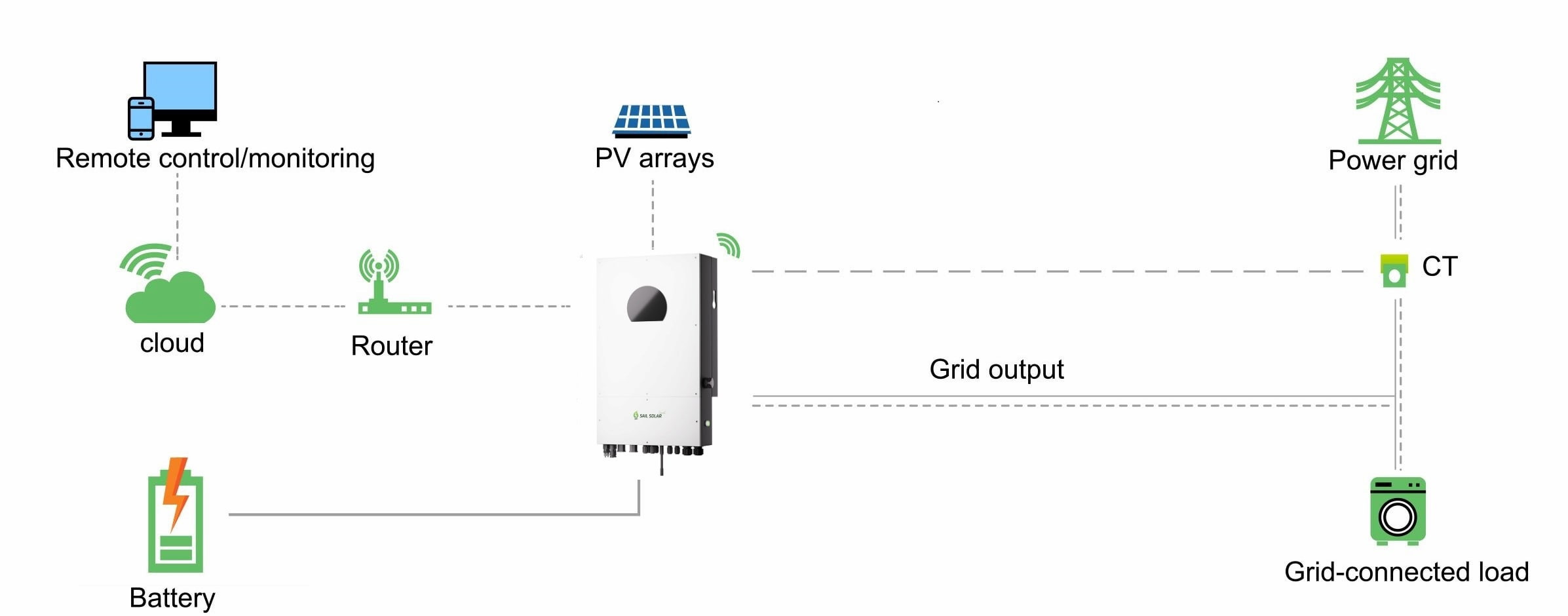 Darüber hinaus unterstützt der Wechselrichter verschiedene Betriebsmodi und Systemkonfigurationen. Ob Sie Ihre netzgekoppelte Solaranlage optimieren oder Ihr netzunabhängiges Notstromsystem aufrüsten möchten – dieser Wechselrichter eignet sich für eine Vielzahl von Anwendungen im Haushalt. Sie können Ihren Strombedarf decken, Ihr Zuhause vor instabilen Stromnetzen und Stromausfällen schützen und gleichzeitig Ihre Stromrechnung Monat für Monat deutlich senken.