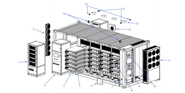 >9 modulare bidirektionale Leistungsumrichter (PCS). Der Container enthält 2 PCS-Schränke mit insgesamt 9 125-kW-PCS. Jeder PCS ist mit einem Batteriecluster verbunden und steuert dessen Lade- und Entladevorgang.