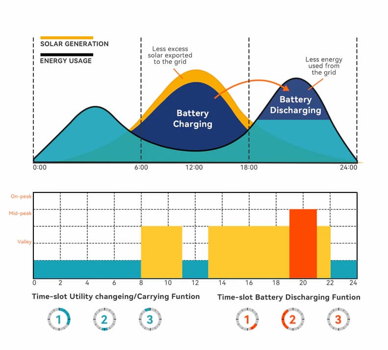 Dieser Solarwechselrichter verfügt über eine zeitgesteuerte Lade-/Entladefunktion. Nutzer können je nach lokalem Stromtarif unterschiedliche Lade- und Entladezeiten einstellen und so Netzstrom und PV-Strom optimal nutzen. Bei hohen Netzstromkosten versorgt der Wechselrichter die angeschlossenen Geräte mit Strom; bei niedrigen Netzstromkosten kann er die Geräte versorgen und gleichzeitig laden. Dadurch können Nutzer ihre Stromkosten maximal senken.