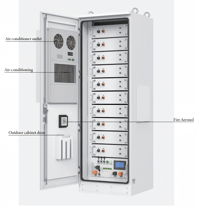 CAN, RS485This outdoor energy storage cabinet features an all-in-one design, combining the energy storage battery system, power distribution control system, thermal management system, and fire protection system into a single cabinet. And the energy storage battery system consists of 10 sets of 100Ah-1P16S battery clusters, with a rated voltage of 512V and a capacity of 50 kWh.