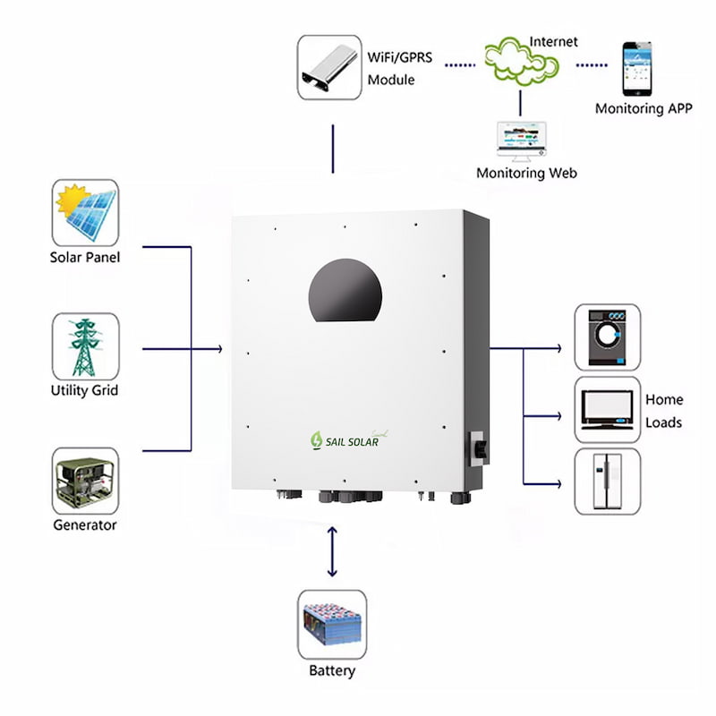 Der dreiphasige 50-kW-Hybridwechselrichter von Sail Solar vereint leistungsstarke Stromwandlung mit fortschrittlichen Hybridfunktionen. Dank seines schlanken Designs ist er einfach zu installieren und steuert Solarstrom, Batteriestrom und Netzstrom intelligent, um ein breites Spektrum an Energielasten zuverlässig zu versorgen.
