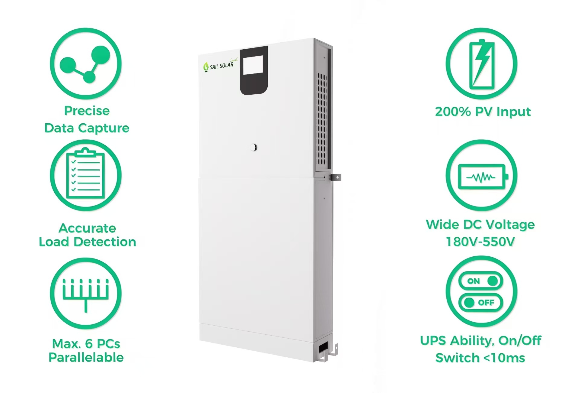 All-in-one Das SAIL SOLAR All-in-One-Solarstromspeichersystem für den Hausgebrauch ist ein multifunktionaler Solarwechselrichter/Solarladegerät, der die Funktionen von Wechselrichter, MPPT-Solarladegerät und Batterieladegerät vereint und so eine unterbrechungsfreie Stromversorgung bietet. Es eignet sich ideal als Notstromversorgung für netzunabhängige Systeme wie Haushaltsgeräte, Elektrowerkzeuge, Industrieanlagen sowie elektronische Audio- und Videogeräte.