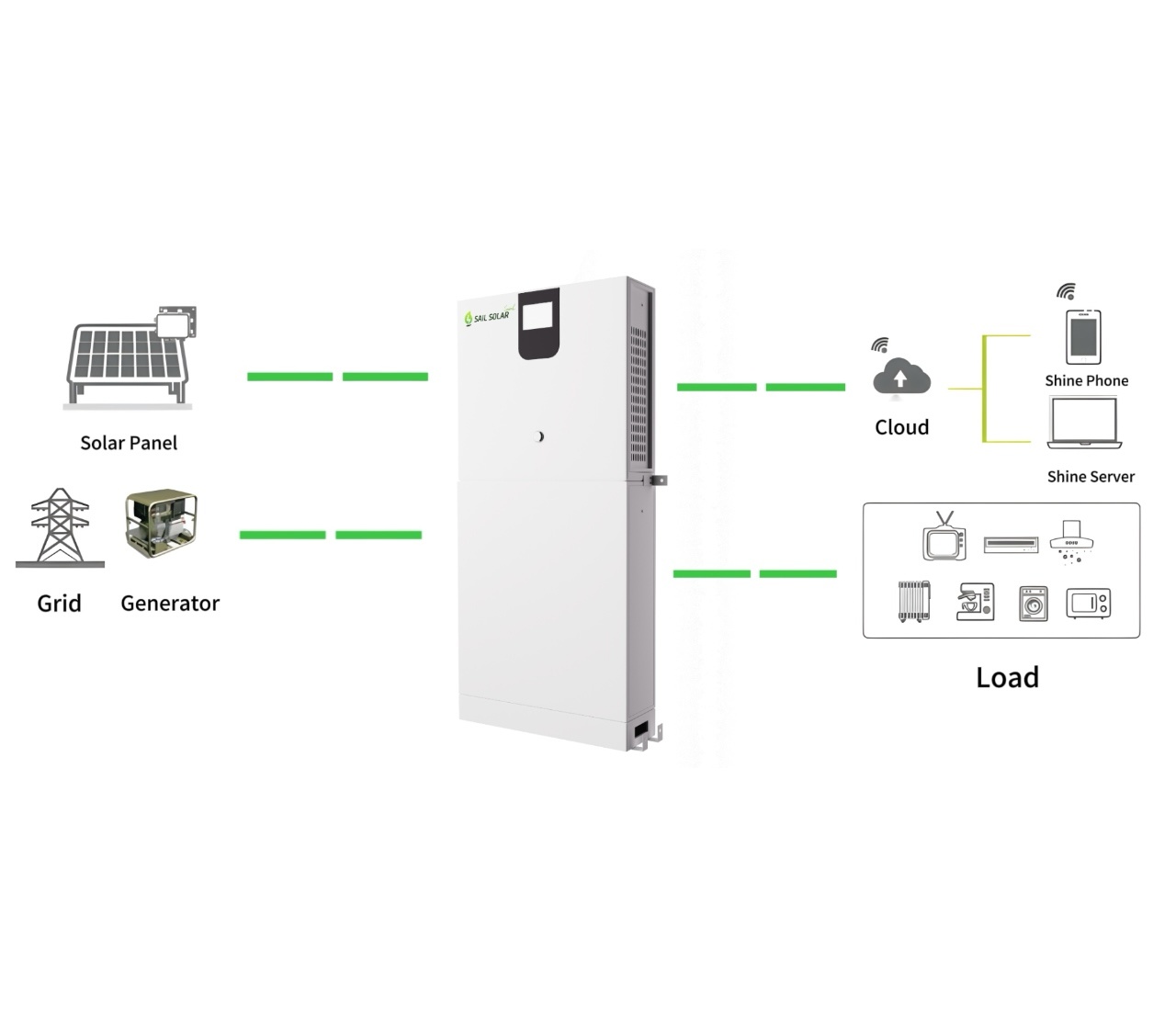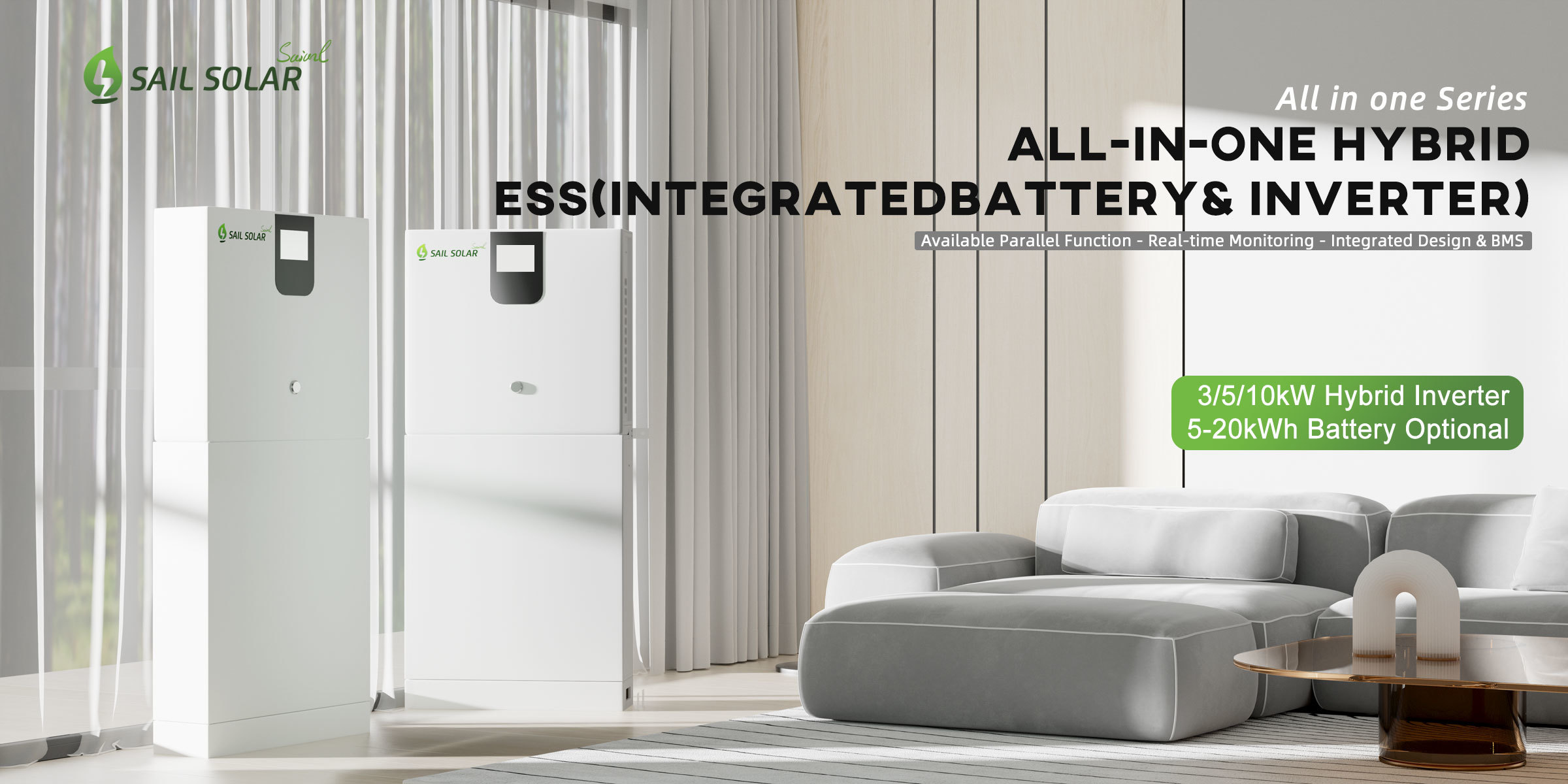 All-in-oneDas SAIL SOLAR All-in-One-Solarstromspeichersystem für den Hausgebrauch ist ein multifunktionaler Solarwechselrichter/Solarladegerät, der die Funktionen von Wechselrichter, MPPT-Solarladegerät und Batterieladegerät vereint und so eine unterbrechungsfreie Stromversorgung bietet. Es eignet sich ideal als Notstromversorgung für netzunabhängige Systeme wie Haushaltsgeräte, Elektrowerkzeuge, Industrieanlagen sowie elektronische Audio- und Videogeräte.