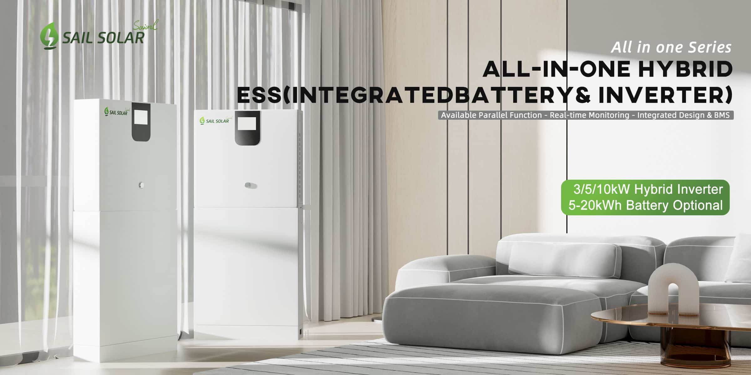 Das All-in-One-Energiespeichersystem (ESS) von SAIL Solar ist eine fortschrittliche Lösung für die Energieversorgung von Privathaushalten. Die Komplettlösung kombiniert einen einphasigen Hybrid-Wechselrichter mit einer Niederspannungs-Lithium-Ionen-Batterie mit einer Kapazität von 5,12 bis 20,48 kWh und bietet so zuverlässige Stromversorgung und maximale Effizienz.