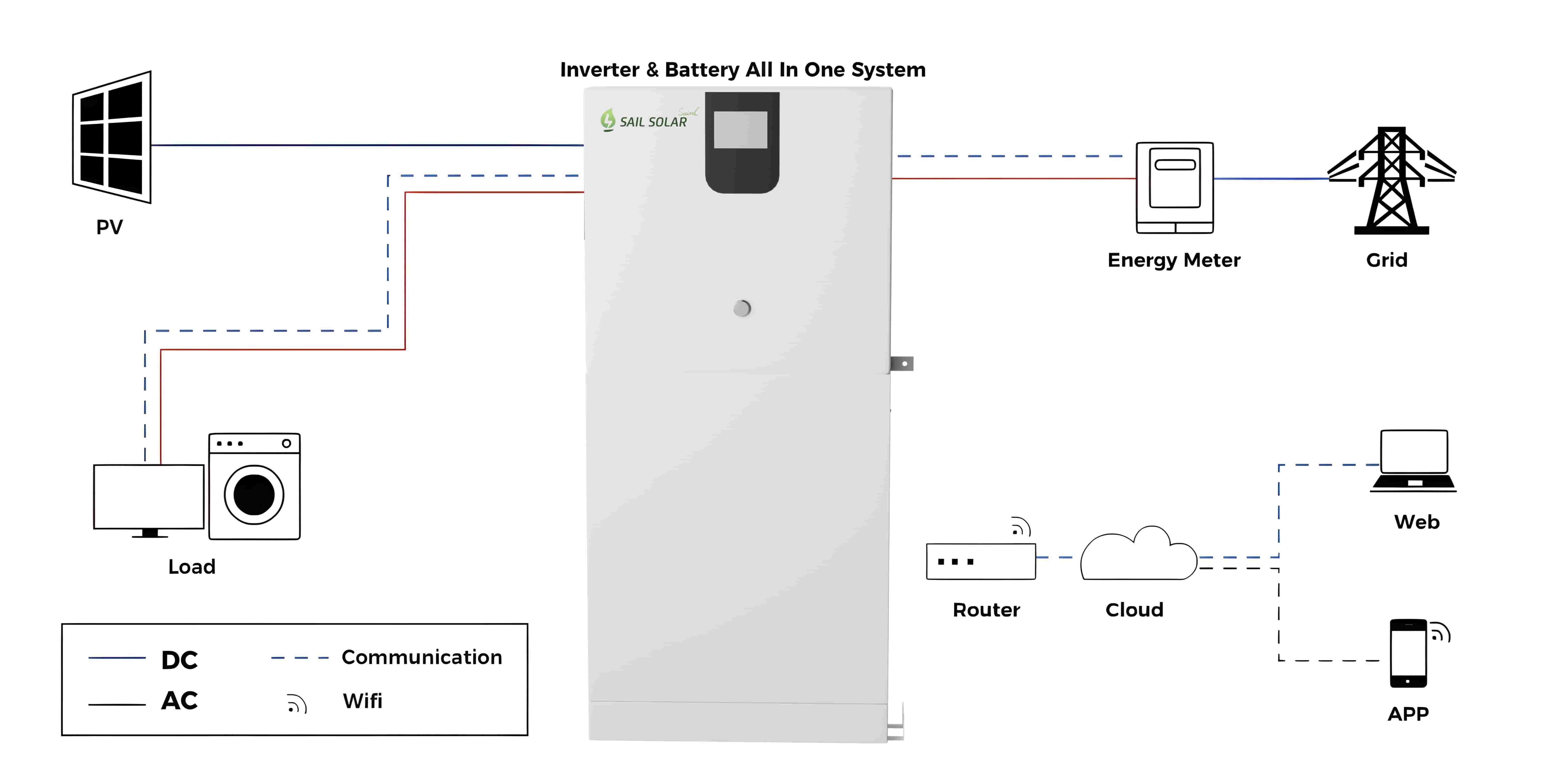 All-in-oneDas SAIL SOLAR All-in-One-Solarstromspeichersystem für den Hausgebrauch ist ein multifunktionaler Solarwechselrichter/Solarladegerät, der die Funktionen von Wechselrichter, MPPT-Solarladegerät und Batterieladegerät vereint und so eine unterbrechungsfreie Stromversorgung bietet. Es eignet sich ideal als Notstromversorgung für netzunabhängige Systeme wie Haushaltsgeräte, Elektrowerkzeuge, Industrieanlagen sowie elektronische Audio- und Videogeräte.